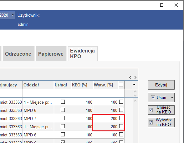 W zakładce Ewidencja KPO pojawiła się nowa kolumna – Wytworzenie %. Działa ona analogicznie do kolumny KEO%. Zaznaczając checkboxy przy wybranych kartach przekazania odpadów można za pomocą przycisku Wytwórz na KEO utworzyć wpisy wytworzenia. Wpis 100 w kolumnie Wytw. [%] oznacza, że 100% masy zostało wykorzystane na karcie ewidencji, jako wpis wytworzenia.